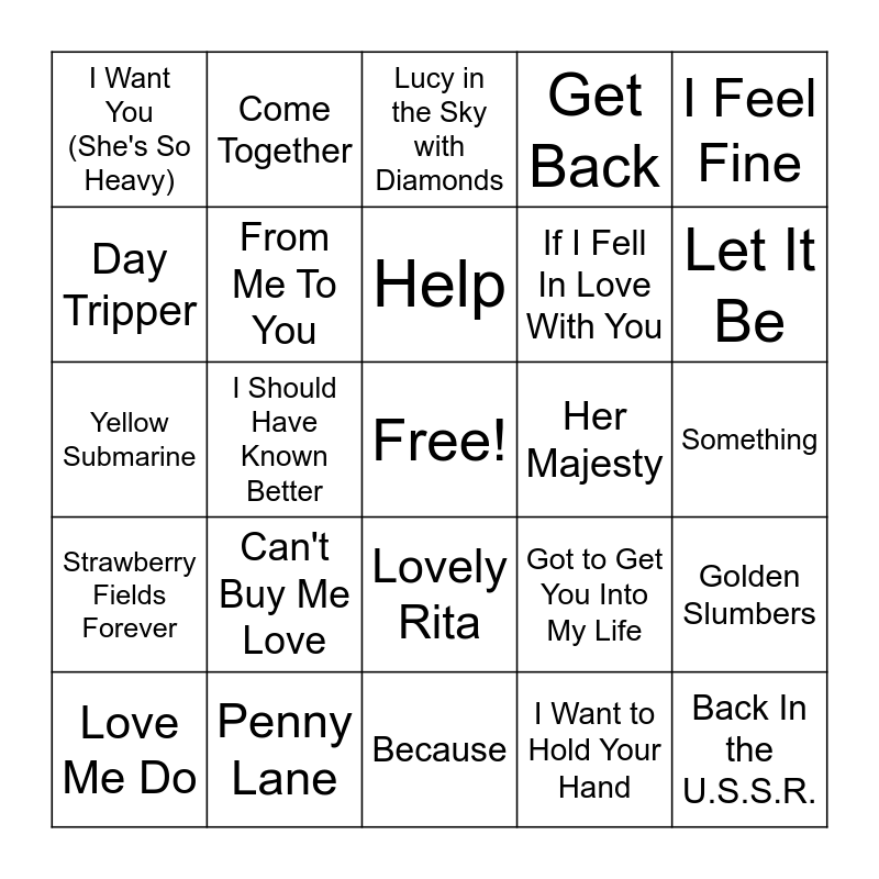 This bingo card has a free space and 51 words: All You Need Is Love, Back In the U.S.S.R., The Ballad of John and Yoko, Because, Can't Buy Me Love, Carry That Weight, Come Together, Across the Universe, Day Tripper, Eight Days A Week, From Me To You, Get Back, Golden Slumbers, Got to Get You Into My Life, A Hard Day's Night, Hello, Goodbye, Help, Her Majesty, Here Comes the Sun, I Feel Fine, I Should Have Known Better, I Want to Hold Your Hand, I Want You (She's So Heavy), If I Fell In Love With You, In My Life, Lady Madonna, Let It Be, The Long and Winding Road, Love Me Do, Lucy in the Sky with Diamonds, Maxwell's Silver Hammer, Mean Mr. Mustard, Octopus's Garden, Oh! Darling, Paperback Writer, Penny Lane, Polythene Pam, Revolution, She Came in Through the Bathroom Window, She Loves You, Something, Strawberry Fields Forever, Ticket To Ride, We Can Work It Out, When I'm 64, With a Little Help From My Friends, Yellow Submarine, Yesterday, You Never Give Me Your Money, Lovely Rita and Hey Jude.