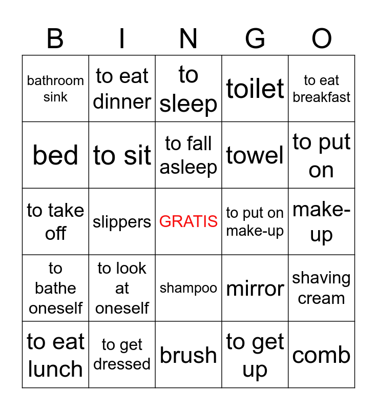 This bingo card has a free space and 34 words: to wake up, to get up, to wash oneself, to shower, to bathe oneself, to sit, to eat breakfast, to eat lunch, to eat dinner, to lay down, to fall asleep, to sleep, to brush oneself, to comb oneself, to put on make-up, to put on, to get dressed, to take off, to look at oneself, mirror, shampoo, soap, bathroom sink, make-up, brush, comb, toilet, to dry oneself, towel, bed, clothes, slippers, shaving cream and toothpaste.