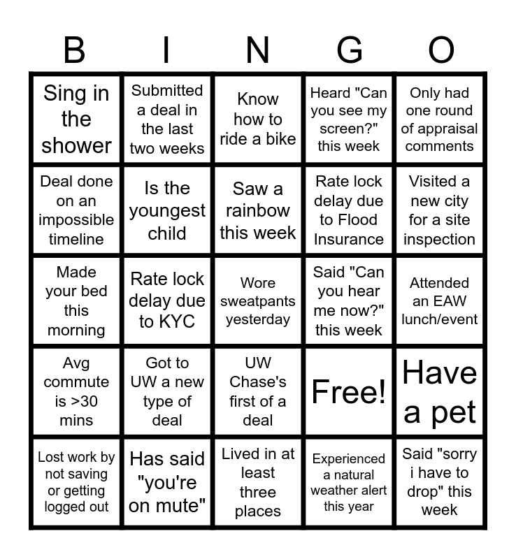 This bingo card has 25 words: Got to UW a new type of deal, Lived in at least three places, Saw a rainbow this week, Lost work by not saving or getting logged out, Only had one round of appraisal comments, Sing in the shower, Deal done on an impossible timeline, Submitted a deal in the last two weeks, Said "Can you hear me now?" this week, UW Chase's first of a deal, Rate lock delay due to Flood Insurance, Made your bed this morning, Free!, Have a pet, Is the youngest child, Said "sorry i have to drop" this week, Attended an EAW lunch/event, Know how to ride a bike, Visited a new city for a site inspection, Rate lock delay due to KYC, Wore sweatpants yesterday, Has said "you're on mute", Avg commute is >30 mins, Heard "Can you see my screen?" this week and Experienced a natural weather alert this year.
