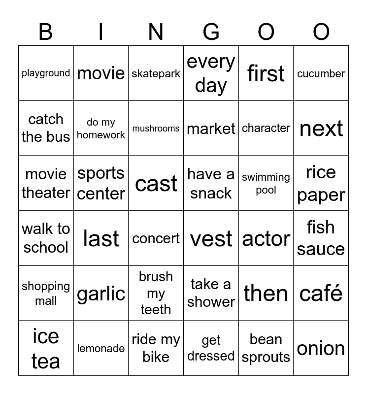 This bingo card has 36 words: take a shower, brush my teeth, get dressed, catch the bus, walk to school, have a snack, do my homework, ride my bike, first, then, next, every day, café, sports center, market, playground, shopping mall, swimming pool, movie theater, skatepark, cast, last, vest, concert, actor, movie, character, lemonade, mushrooms, cucumber, onion, ice tea, fish sauce, rice paper, garlic and bean sprouts.