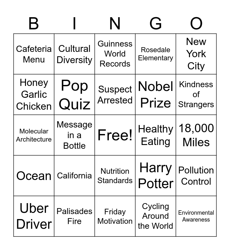 This bingo card has a free space and 24 words: California, Palisades Fire, Suspect Arrested, Uber Driver, New York City, Cafeteria Menu, Honey Garlic Chicken, Cultural Diversity, Healthy Eating, Nutrition Standards, Nobel Prize, Molecular Architecture, Harry Potter, Pollution Control, Pop Quiz, Cycling Around the World, 18,000 Miles, Guinness World Records, Kindness of Strangers, Message in a Bottle, Environmental Awareness, Ocean, Rosedale Elementary and Friday Motivation.