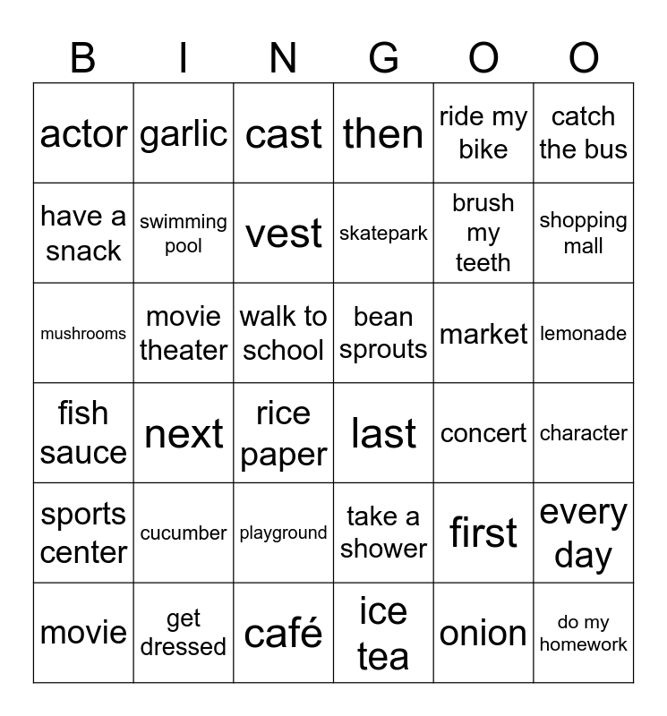 This bingo card has 36 words: take a shower, playground, ice tea, have a snack, fish sauce, bean sprouts, swimming pool, café, ride my bike, first, shopping mall, then, every day, movie theater, skatepark, actor, sports center, market, mushrooms, cast, walk to school, next, last, rice paper, concert, garlic, brush my teeth, get dressed, vest, catch the bus, do my homework, movie, character, lemonade, cucumber and onion.