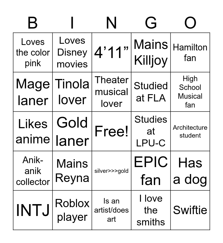 This bingo card has a free space and 27 words: EPIC fan, The Marias lover, Studied at FLA, Is an artist/does art, Mage laner, 4’11”, Loves Disney movies, Anik-anik collector, Studies at LPU-C, Has a dog, Likes anime, Mains Killjoy, INTJ, Roblox player, High School Musical fan, K-Pop Fan, Tinola lover, Theater musical lover, Mains Reyna, Loves the color pink, Architecture student, I love the smiths, Gold laner, Swiftie, silver>>>gold, Hamilton fan and Plays valorant.