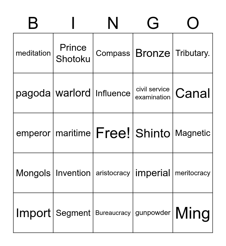 This bingo card has a free space and 24 words: Invention, Segment, Influence, Import, Tributary., meditation, pagoda, Prince Shotoku, Shinto, aristocracy, civil service examination, emperor, imperial, meritocracy, warlord, gunpowder, Magnetic, Compass, Canal, maritime, Ming, Mongols, Bronze and Bureaucracy.