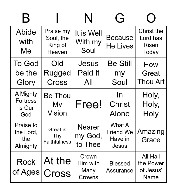 This bingo card has a free space and 24 words: Great is Thy Faithfulness, At the Cross, Jesus Paid it All, Rock of Ages, Christ the Lord has Risen Today, Abide with Me, To God be the Glory, Praise my Soul, the King of Heaven, In Christ Alone, Nearer my God, to Thee, Be Still my Soul, A Mighty Fortress is Our God, What A Friend We Have in Jesus, Amazing Grace, Old Rugged Cross, Blessed Assurance, Holy, Holy, Holy, It is Well With my Soul, How Great Thou Art, Be Thou My Vision, All Hail the Power of Jesus' Name, Praise to the Lord, the Almighty, Because He Lives and Crown Him with Many Crowns.
