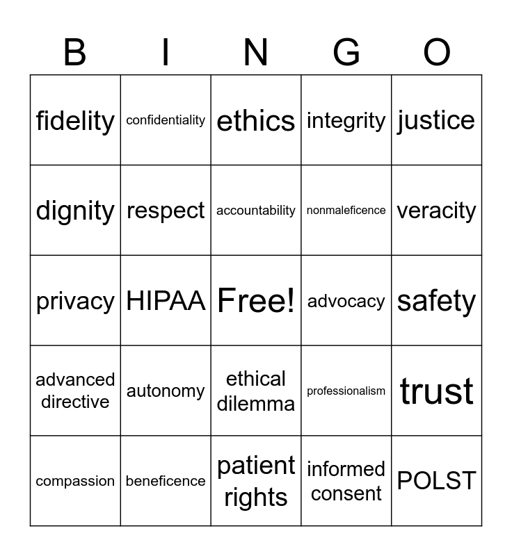 This bingo card has a free space and 24 words: autonomy, beneficence, accountability, compassion, justice, fidelity, dignity, confidentiality, advocacy, ethical dilemma, nonmaleficence, privacy, professionalism, trust, respect, informed consent, safety, ethics, veracity, HIPAA, POLST, advanced directive, integrity and patient rights.
