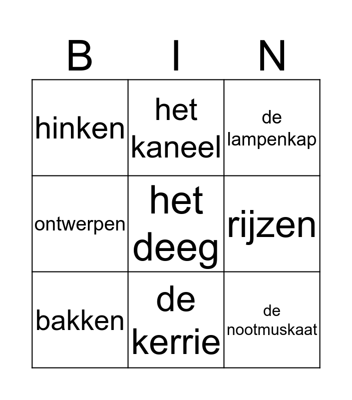 This bingo card has 18 words: Free!, de rolmaat, de lampenkap, hinken, de plattegrond, ontwerpen, de specerijen, het kaneel, de kerrie, de nootmuskaat, het bakmeel, het deeg, kneden, rijzen, bakken, de bereidingswijze, de ingrediënten and het recept.