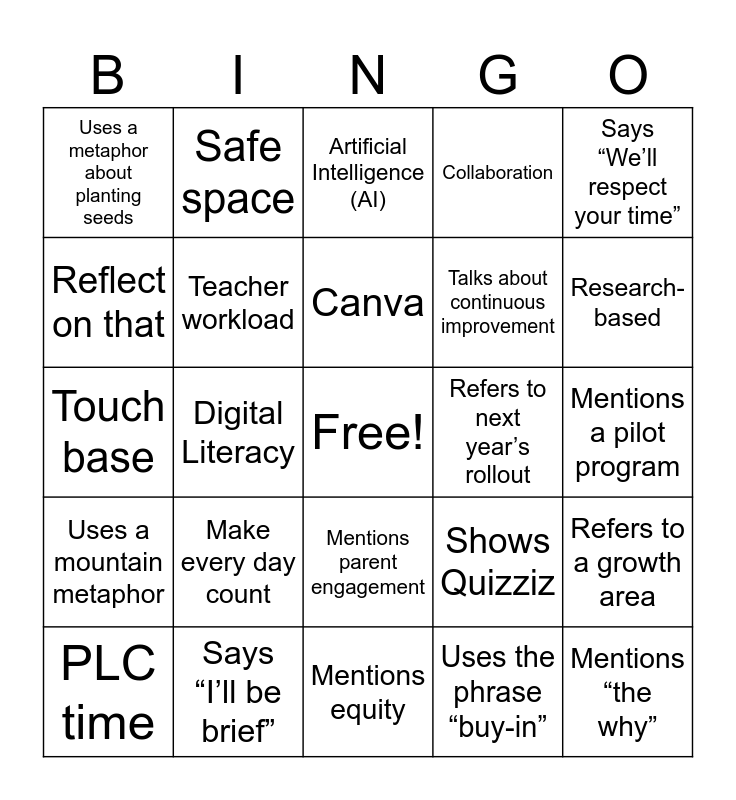 This bingo card has a free space and 74 words: Data-driven, Best practices, Artificial Intelligence (AI), Let’s unpack that, Circle back, Student-centered, Deep Learning, Prompt, PLC time, Growth mindset, Algorithm, Plagiarism Detection, Canva, Reflect on that, Ice Breaker, Digital Literacy, Next steps, Research-based, Digital footprint, Touch base, Teacher workload, Safe space, Collaboration, Chat GPT, Mentions “the why”, References a sports analogy, Brings up IEPs, Uses a “condensed” PowerPoint, Says “This will be quick”, Plays an inspirational video, Says “We’ll respect your time”, Passes out a handout that’s also emailed, Mindfulness, Says “We’re all in this together”, Cites research from 2010, Uses the phrase “buy-in”, Talks about AI in the classroom, Differentiation, Brings up accountability, Uses the word “intentional”, Mentions equity, Says “I’ll be brief”, Mentions student attendance, Refers to “district vision”, Mentions “core values”, Uses a metaphor about planting seeds, Talks about collaboration as key, Make every day count, References a new initiative, Mentions professional learning, Instructional Time, Quotes a famous educator, Mentions a pilot program, Talks about “shared ownership”, Refers to student agency, Uses an acronym, Mentions parent engagement, Building relationships, Mentions leadership, Refers to a growth area, Talks about continuous improvement, Mentions the importance of relationships, Uses a mountain metaphor, Says “dig deeper”, Refers to next year’s rollout, Mentions report cards, Quotes from a TED Talk, Mentions the word “feedback”, Shows Quizziz, Google Classroom, Mentions teacher burnout, Says “pivot”, Uses the word “alignment” and Says “we’ll revisit that later”.
