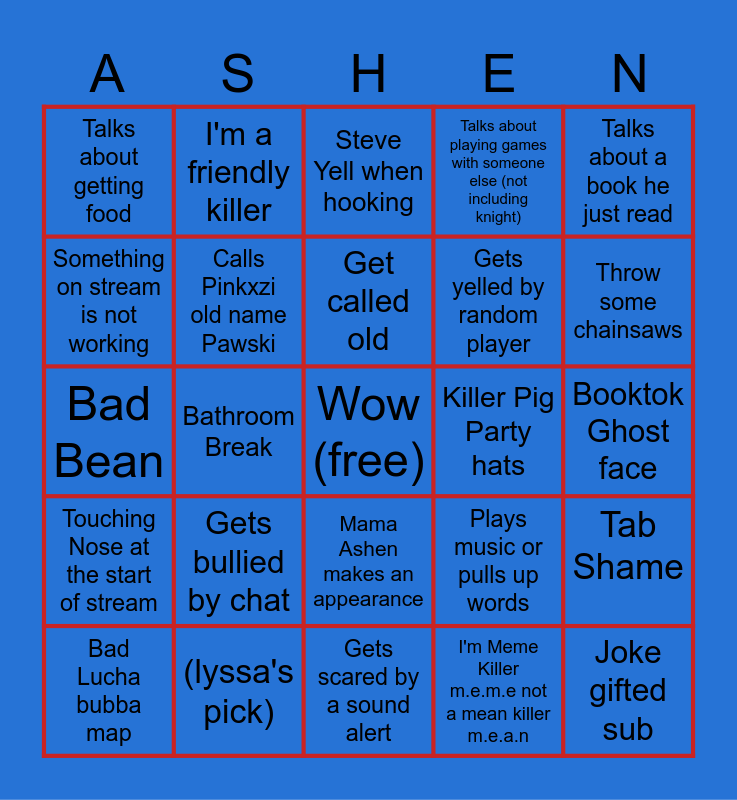 This bingo card has a free space and 24 words: Gets bullied by chat, (lyssa's pick), Get called old, Bad Lucha bubba map, Talks about a book he just read, Talks about getting food, Something on stream is not working, I'm a friendly killer, Killer Pig Party hats, Mama Ashen makes an appearance, Gets yelled by random player, Bad Bean, Plays music or pulls up words, Tab Shame, Calls Pinkxzi old name Pawski, I'm Meme Killer m.e.m.e not a mean killer m.e.a.n, Booktok Ghost face, Steve Yell when hooking, Throw some chainsaws, Bathroom Break, Joke gifted sub, Touching Nose at the start of stream, Talks about playing games with someone else (not including knight) and Gets scared by a sound alert.