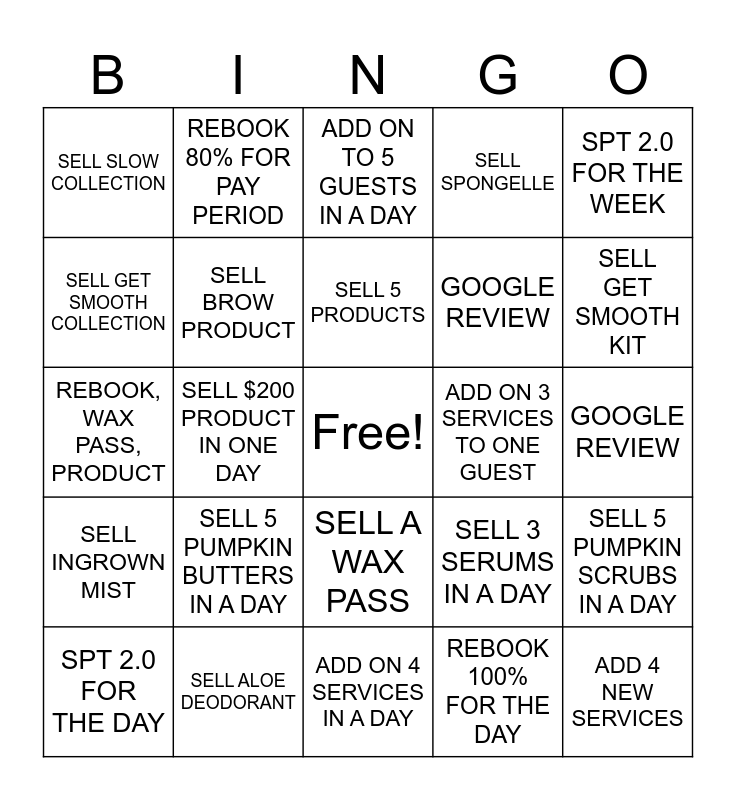 This bingo card has a free space and 25 words: SELL 5 PUMPKIN BUTTERS IN A DAY, ADD ON 4 SERVICES IN A DAY, SELL 5 PRODUCTS, SPT 2.0 FOR THE DAY, SPT 2.0 FOR THE WEEK, SELL SLOW COLLECTION, SELL GET SMOOTH COLLECTION, REBOOK 80% FOR PAY PERIOD, ADD ON 3 SERVICES TO ONE GUEST, SELL A WAX PASS, GOOGLE REVIEW, REBOOK, WAX PASS, PRODUCT, SELL 3 SERUMS IN A DAY, SELL 5 PUMPKIN SCRUBS IN A DAY, SELL BROW PRODUCT, SELL 3 TRAVEL PRODUCTS TO A GUEST, GOOGLE REVIEW, ADD ON TO 5 GUESTS IN A DAY, SELL GET SMOOTH KIT, SELL $200 PRODUCT IN ONE DAY, ADD 4 NEW SERVICES, SELL ALOE DEODORANT, SELL INGROWN MIST, SELL SPONGELLE and REBOOK 100% FOR THE DAY.