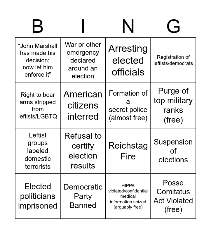 This bingo card has 16 words: Democratic Party Banned, Suspension of elections, Arresting elected officials, “John Marshall has made his decision; now let him enforce it”, Leftist groups labeled domestic terrorists, War or other emergency declared around an election, Reichstag Fire, HIPPA violated/confidential medical information seized (arguably free), Right to bear arms stripped from leftists/LGBTQ, American citizens interred, Elected politicians imprisoned, Registration of leftists/democrats, Refusal to certify election results, Purge of top military ranks (free), Formation of a secret police (almost free) and Posse Comitatus Act Violated (free).