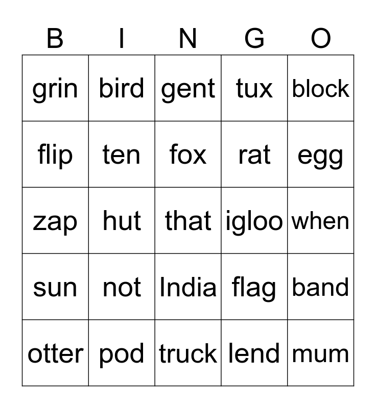 This bingo card has a free space and 24 words: not, pod, fox, otter, block, grin, flip, bird, igloo, India, rat, zap, flag, band, ten, lend, when, gent, egg, hut, mum, sun, tux and truck.