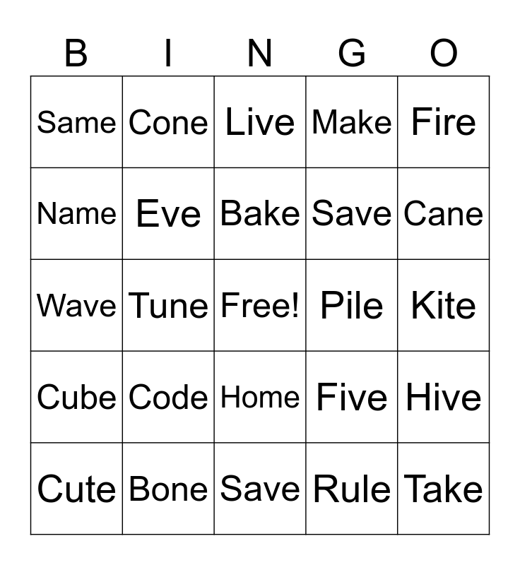 This bingo card has a free space and 24 words: Code, Bone, Bake, Cute, Fire, Same, Name, Cone, Pile, Home, Save, Wave, Five, Hive, Eve, Rule, Kite, Live, Cane, Tune, Take, Cube, Make and Save.