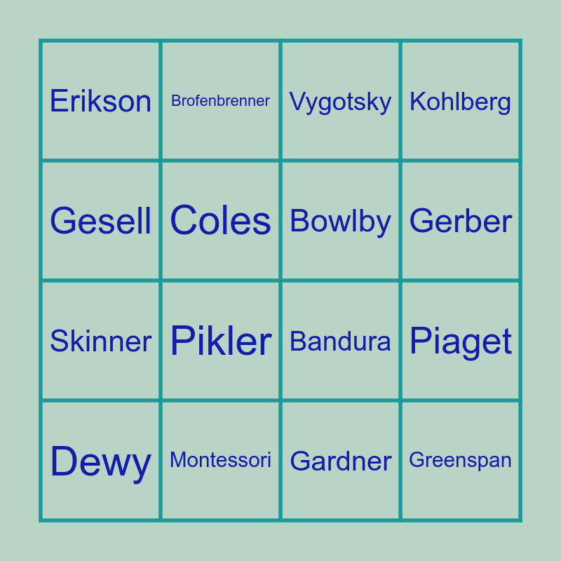 This bingo card has 16 words: Montessori, Piaget, Vygotsky, Erikson, Skinner, Brofenbrenner, Bandura, Gardner, Gesell, Coles, Dewy, Kohlberg, Pikler, Gerber, Bowlby and Greenspan.