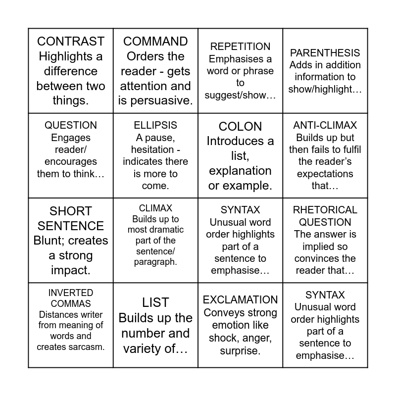 This bingo card has 16 words: LIST Builds up the number and variety of…, RHETORICAL QUESTION The answer is implied so convinces the reader that…, REPETITION Emphasises a word or phrase to suggest/show…, CONTRAST Highlights a difference between two things., SHORT SENTENCE Blunt; creates a strong impact., COMMAND Orders the reader - gets attention and is persuasive., SYNTAX Unusual word order highlights part of a sentence to emphasise…, EXCLAMATION Conveys strong emotion like shock, anger, surprise., QUESTION Engages reader/ encourages them to think…, ELLIPSIS A pause, hesitation - indicates there is more to come., INVERTED COMMAS Distances writer from meaning of words and creates sarcasm., PARENTHESIS Adds in addition information to show/highlight…, CLIMAX Builds up to most dramatic part of the sentence/ paragraph., ANTI-CLIMAX Builds up but then fails to fulfil the reader’s expectations that…, COLON Introduces a list, explanation or example. and SYNTAX Unusual word order highlights part of a sentence to emphasise….