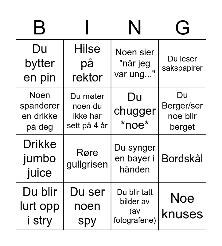This bingo card has 16 words: Du ser noen spy, Bordskål, Noen sier "når jeg var ung...", Du bytter en pin, Drikke jumbo juice, Hilse på rektor, Du synger en bayer i hånden, Du blir tatt bilder av (av fotografene), Noen spanderer en drikke på deg, Du møter noen du ikke har sett på 4 år, Du blir lurt opp i stry, Du leser sakspapirer, Røre gullgrisen, Du Berger/ser noe blir berget, Du chugger *noe* and Noe knuses.