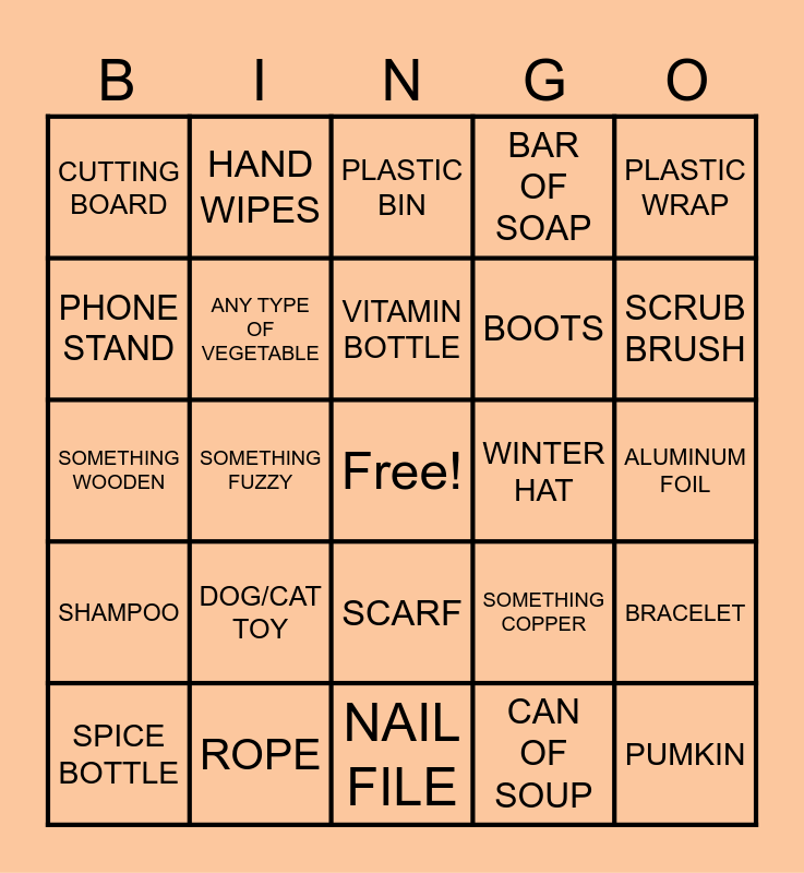 This bingo card has a free space and 24 words: DOG/CAT TOY, ROPE, VITAMIN BOTTLE, SPICE BOTTLE, PLASTIC WRAP, CUTTING BOARD, PHONE STAND, HAND WIPES, WINTER HAT, SCARF, BOOTS, SOMETHING WOODEN, SOMETHING COPPER, BRACELET, ANY TYPE OF VEGETABLE, CAN OF SOUP, ALUMINUM FOIL, PLASTIC BIN, SCRUB BRUSH, SOMETHING FUZZY, PUMKIN, SHAMPOO, BAR OF SOAP and NAIL FILE.