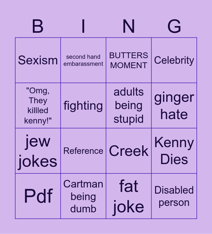 This bingo card has 16 words: Cartman being dumb, Kenny Dies, BUTTERS MOMENT, Sexism, jew jokes, second hand embarassment, Creek, fat joke, "Omg, They killled kenny!", fighting, Pdf, Celebrity, Reference, ginger hate, adults being stupid and Disabled person.