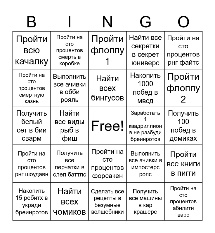This bingo card has a free space and 24 words: Получить все перчатки в слеп баттлс, Найти всех чомиков, Найти всех бингусов, Накопить 15 ребитх в укради бреинротов, Пройти на сто процентов рнг файтс, Пройти всю качалку, Пройти на сто процентов смертную казнь, Пройти на сто процентов смерть в коробке, Заработать 1 квадриллион в не разбуди бреинротов, Пройти на сто процентов форсакен, Накопить 1000 побед в мвсд, Получить белый сет в бии сварм, Выполнить все ачивки в импостерс ролс, Пройти все книги в пигги, Выполнить все ачивки в обби рояль, Получить все машины в кар крашерс, Получить 100 побед в домиках, Пройти флоппу 1, Пройти флоппу 2, Найти все виды рыб в фиш, Пройти на сто процентов абилити варс, Пройти на сто процентов рнг шоудавн, Найти все секретки в секрет юниверс and Сделать все рецепты в безумные волшебники.
