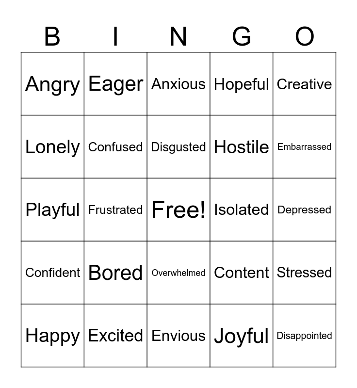 This bingo card has a free space and 29 words: Happy, Sad, Frustrated, Jealous, Angry, Anxious, Confused, Bored, Isolated, Excited, Depressed, Disappointed, Envious, Joyful, Embarrassed, Worried, Overwhelmed, Confident, Creative, Playful, Content, Scared, Hostile, Lonely, Hopeful, Eager, Stressed, Disgusted and Proud.
