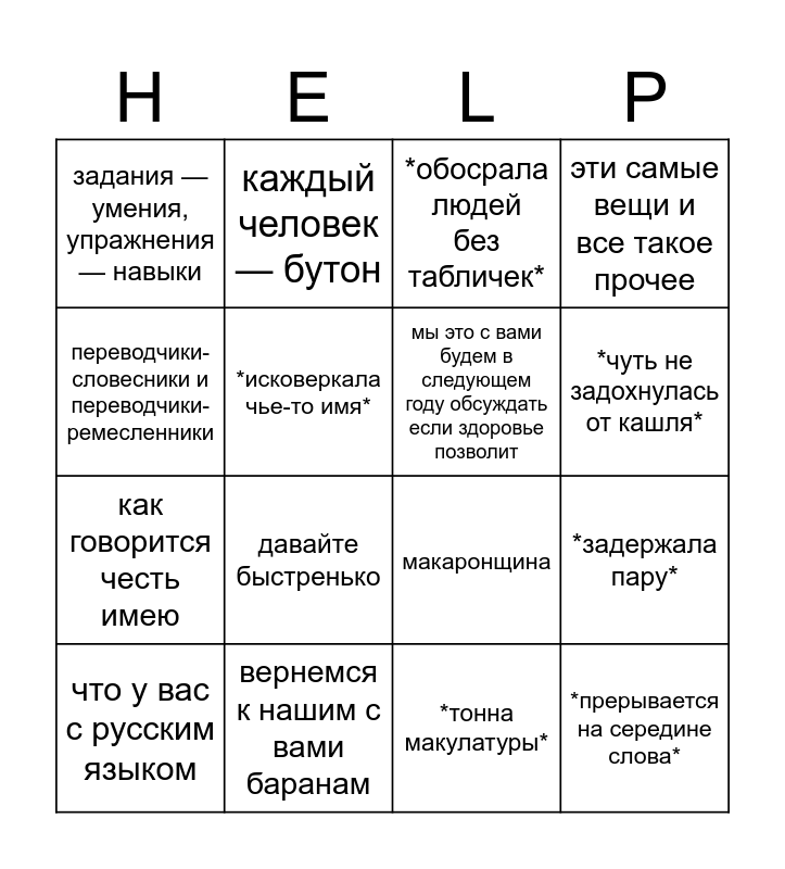 This bingo card has 16 words: вернемся к нашим с вами баранам, *задержала пару*, *обосрала людей без табличек*, задания — умения, упражнения — навыки, как говорится честь имею, каждый человек — бутон, макаронщина, *тонна макулатуры*, переводчики-словесники и переводчики-ремесленники, *исковеркала чье-то имя*, что у вас с русским языком, эти самые вещи и все такое прочее, давайте быстренько, *чуть не задохнулась от кашля*, мы это с вами будем в следующем году обсуждать если здоровье позволит and *прерывается на середине слова*.