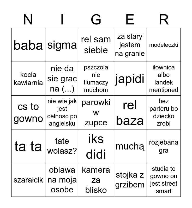 This bingo card has a free space and 24 words: tate wolasz?, oblawa na moja osobe, pszczola nie tlumaczy muchom, szarałcik, modeleczki, baba, kocia kawiarnia, sigma, rel baza, iks didi, japidi, cs to gowno, muchą, rozjebana gra, nie da sie grac na (...), stojka z grzibem, bez parteru bo dziecko zrobi, rel sam siebie, iłownica albo landek mentioned, nie wie jak jest celnosc po angielsku, studia to gowno on jest street smart, ta ta, za stary jestem na granie and kamera za blisko.