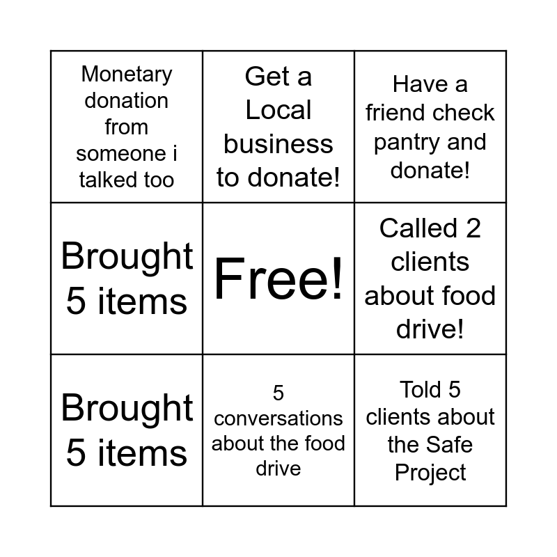 This bingo card has a free space and 8 words: Called 2 clients about food drive!, Have a friend check pantry and donate!, Get a Local business to donate!, Brought 5 items, Monetary donation from someone i talked too, Told 5 clients about the Safe Project, Brought 5 items and 5 conversations about the food drive.