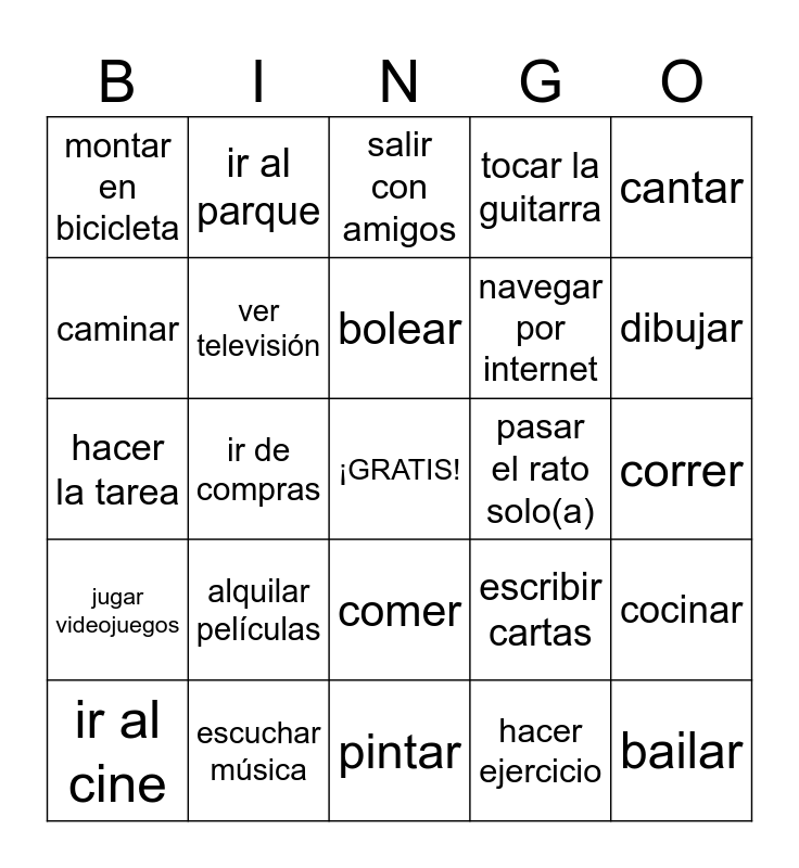 This bingo card has a free space and 29 words: ir al cine, leer, ir de compras, practicar deportes, montar en bicicleta, salir con amigos, ver televisión, alquilar películas, pasar el rato solo(a), escuchar música, correr, bailar, pintar, hacer ejercicio, dibujar, jugar deportes, comer, jugar videojuegos, cantar, hacer la tarea, escribir cartas, nadar, navegar por internet, caminar, tocar la guitarra, ir al parque, cocinar, bolear and ayudar en la comunidad.