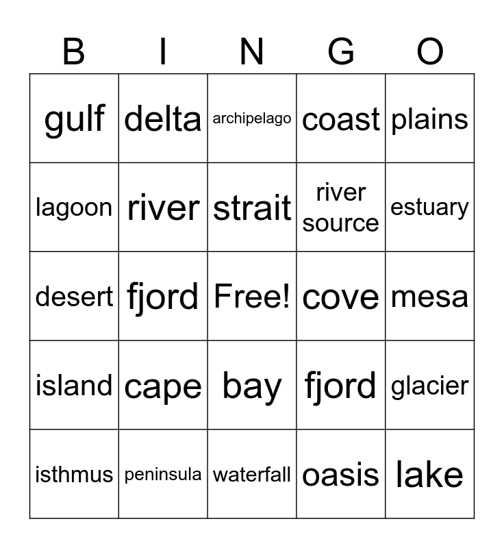 This bingo card has a free space and 30 words: canyon, peninsula, archipelago, plateau, plains, gulf, river, strait, river source, lake, isthmus, cape, oasis, valley, island, swamp, waterfall, cove, glacier, lagoon, fjord, mountian range, coast, mesa, desert, delta, bay, fjord, estuary and canal.
