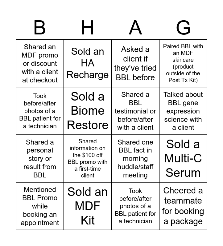 This bingo card has 20 words: Sold a Multi-C Serum, Talked about BBL gene expression science with a client, Asked a client if they’ve tried BBL before, Handed out a BBL brochure, Mentioned BBL Promo while booking an appointment, Took before/after photos of a BBL patient for a technician, Sold an MDF Kit, Shared an MDF promo or discount with a client at checkout, Shared a personal story or result from BBL, Sold an HA Recharge, Shared information on the $100 off BBL promo with a first-time client, Shared one BBL fact in morning huddle/staff meeting, Sold a Biome Restore, Cheered a teammate for booking a package, Shared a BBL testimonial or before/after with a client, Added any MDF product to a patient’s treatment plan, Talked about BBL gene expression science with a client, Paired BBL with an MDF skincare (product outside of the Post Tx Kit), Took before/after photos of a BBL patient for a technician and Shared a personal story or result from BBL.