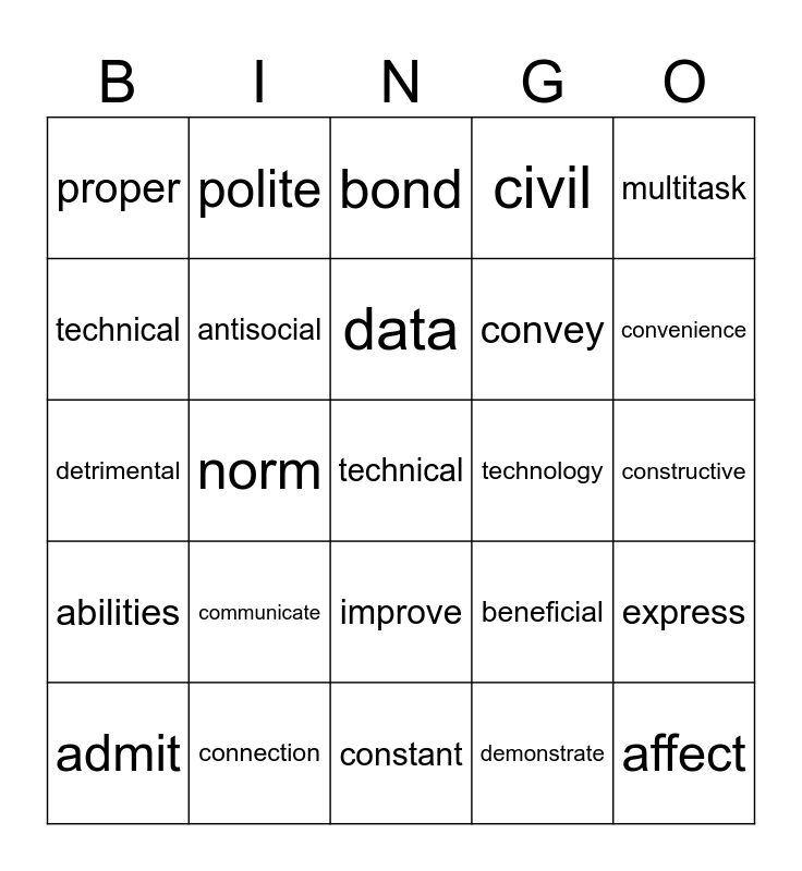 This bingo card has a free space and 29 words: admit, formal, norm, distract, proper, bond, antisocial, communicate, technology, connection, constructive, affect, constant, demonstrate, convenience, decline, improve, abilities, multitask, detrimental, beneficial, articulate, convey, technical, civil, polite, express, data and statistic.