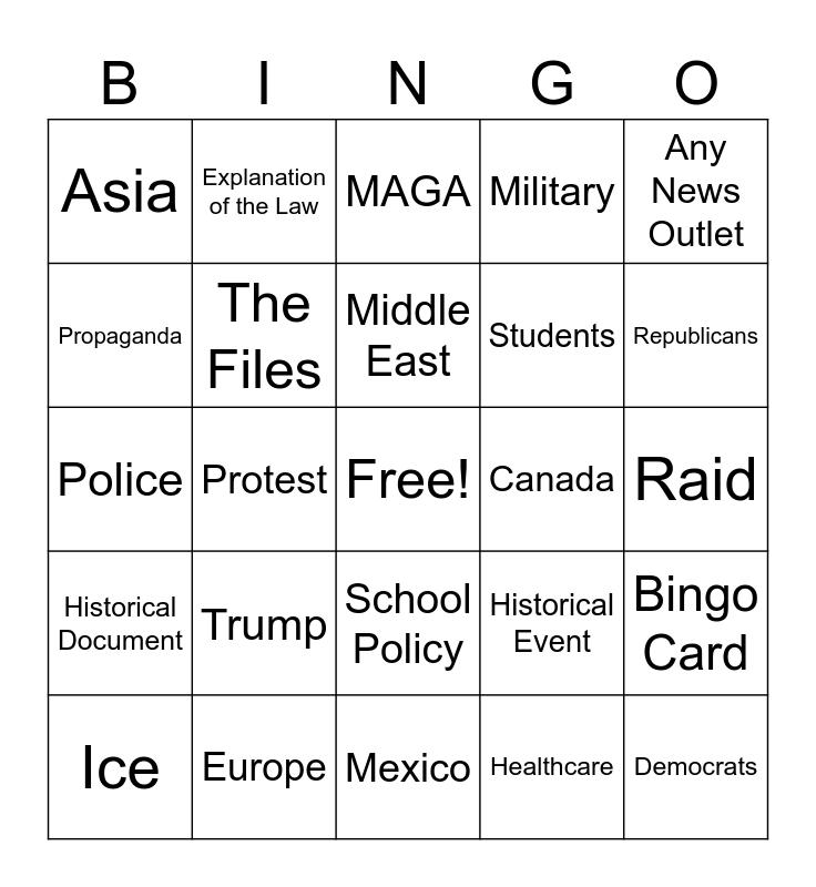 This bingo card has a free space and 24 words: Trump, Europe, Middle East, Ice, Any News Outlet, Asia, Propaganda, Explanation of the Law, Canada, School Policy, Students, Police, Historical Event, Bingo Card, The Files, Healthcare, Raid, MAGA, Republicans, Protest, Democrats, Historical Document, Military and Mexico.