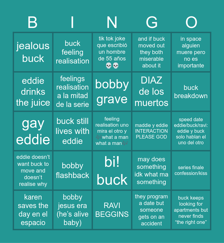 This bingo card has a free space and 24 words: bobby flashback, bobby jesus era (he’s alive baby), bobby grave, karen saves the day en el espacio, in space alguien muere pero no es importante, jealous buck, eddie drinks the juice, buck feeling realisation, maddie y eddie INTERACTION PLEASE GOD, bi! buck, DIAZ de los muertos, gay eddie, may does something idk what ma something, series finale confession/kiss, feelings realisation a la mitad de la serie, they program a date but someone gets on an accident, speed date eddie/buck/ravi: eddie y buck solo hablan el uno del otro, tik tok joke que escribió un hombre de 55 años💀💀, buck breakdown, buck still lives with eddie, buck keeps looking for apartments but never finds “the right one”, eddie doesn’t want buck to move and doesn’t realise why, and if buck moved out they both miserable about it and RAVI BEGGINS.