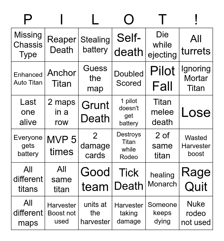 This bingo card has 36 words: Tick Death, Good team, Harvester taking damage, Enhanced Auto Titan, Everyone gets battery, 1 pilot doesn't get battery, Anchor Titan, units at the harvester, Die while ejecting, healing Monarch, Ignoring Mortar Titan, Self-death, Rage Quit, 2 maps in a row, Doubled Scored, Missing Chassis Type, All different titans, Titan melee death, Last one alive, Stealing battery, Grunt Death, MVP 5 times, Destroys Titan while Rodeo, 2 damage cards, 2 of same titan, Reaper Death, Pilot Fall, Harvester Boost not used, Guess the map, All turrets, Nuke rodeo not used, All different maps, Wasted Harvester boost, Lose, All same titan and Someone keeps dying.