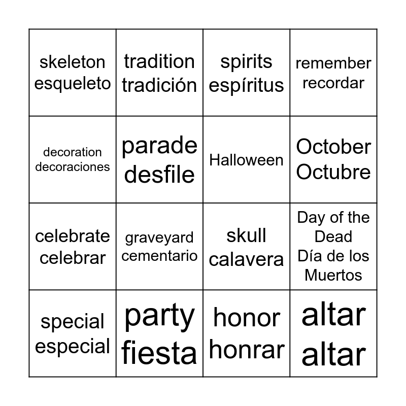 This bingo card has 18 words: graveyard cementario, altar altar, spirits espíritus, skeleton esqueleto, skull calavera, remember recordar, special especial, tradition tradición, October Octubre, celebrate celebrar, honor honrar, decoration decoraciones, Day of the Dead Día de los Muertos, parade desfile, Halloween, trick or treat, party fiesta and witches brujas.