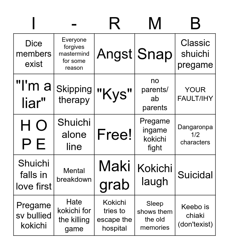This bingo card has a free space and 24 words: Mental breakdown, Hate kokichi for the killing game, "Kys", Pregame sv bullied kokichi, Classic shuichi pregame, Dice members exist, "I'm a liar", Everyone forgives mastermind for some reason, Pregame ingame kokichi fight, Maki grab, no parents/ ab parents, H O P E, Kokichi laugh, Suicidal, Skipping therapy, Sleep shows them the old memories, Dangaronpa 1/2 characters, Angst, YOUR FAULT/IHY, Shuichi alone line, Keebo is chiaki (don'texist), Shuichi falls in love first, Snap and Kokichi tries to escape the hospital.