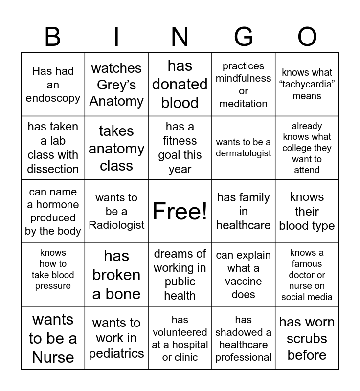 This bingo card has a free space and 29 words: wants to be a Nurse, wants to be a Doctor, wants to be a Radiologist, wants to be a Dentist, Has had an endoscopy, has donated blood, takes anatomy class, has broken a bone, has family in healthcare, wants to work in pediatrics, knows their blood type, has worn scrubs before, has volunteered at a hospital or clinic, has shadowed a healthcare professional, already knows what college they want to attend, wants to help deliver babies, dreams of working in public health, knows how to take blood pressure, knows what “tachycardia” means, can name a hormone produced by the body, can explain what a vaccine does, wants to be an occupational therapist, wants to be a dermatologist, has taken a lab class with dissection, practices mindfulness or meditation, watches Grey’s Anatomy, knows a famous doctor or nurse on social media, has a fitness goal this year and takes vitamins or supplements.