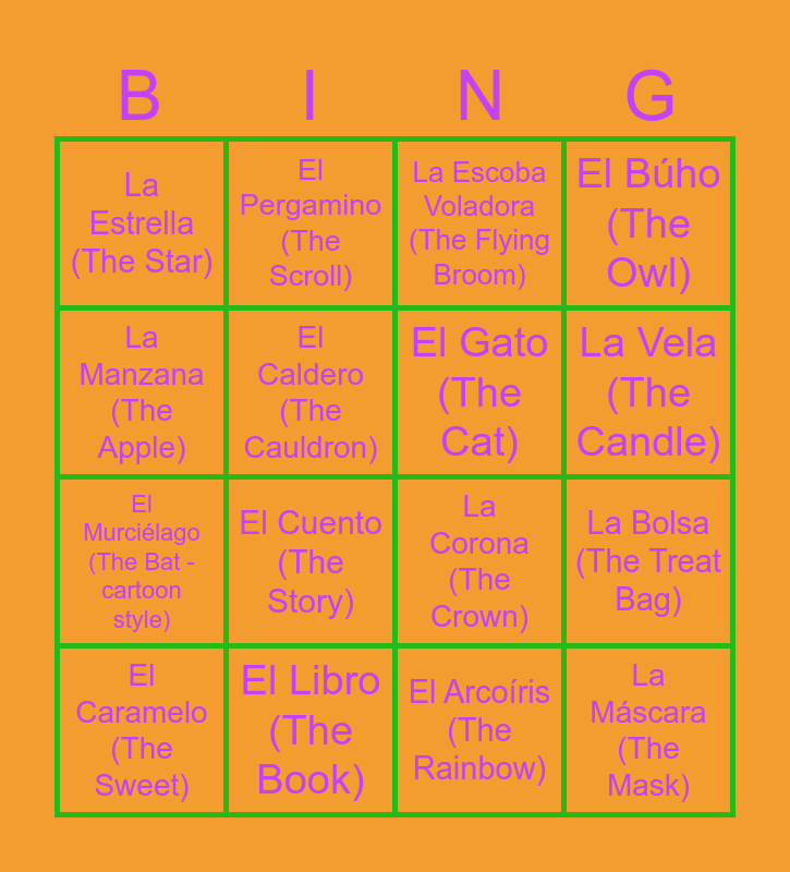 This bingo card has 61 words: Free!, La Calabaza (The Pumpkin), El Dulce (The Candy), La Máscara (The Mask), El Disfraz (The Costume), La Escoba (The Broom), El Gato (The Cat), La Luna (The Moon), El Murciélago (The Bat - cartoon style), La Linterna (The Lantern), El Búho (The Owl), La Araña (The Spider - cartoon style), El Caldero (The Cauldron), La Telaraña (The Cobweb), El Sombrero (The Witch Hat), La Estrella (The Star), El Caramelo (The Sweet), La Manzana (The Apple), El Espantapájaros (The Scarecrow), La Vela (The Candle), El Libro (The Book), La Escoba Voladora (The Flying Broom), El Sapo (The Toad), La Luna Llena (The Full Moon), El Espejo (The Mirror), La Mascota (The Pet), El Árbol (The Tree), La Niebla (The Fog), El Cuento (The Story), La Serpentina (The Streamer), El Chocolate (The Chocolate), La Piñata (The Piñata), El Mago (The Magician), La Varita (The Wand), El Pergamino (The Scroll), La Campana (The Bell), El Reloj (The Clock), La Bolsa (The Treat Bag), El Lazo (The Bow), La Corona (The Crown), El Sombrero (The Hat), La Capa (The Cape), El Arcoíris (The Rainbow), La Nube (The Cloud), El Hechizo (The Magic Spell), La Estrella Fugaz (The Shooting Star), El Duende (The Friendly Elf), La Mariposa (The Butterfly), El Gorro (The Cap), La Flor (The Flower), El Amuleto (The Amulet), La Bufanda (The Scarf), El Listón (The Ribbon), La Luciérnaga (The Firefly), El Farol (The Lantern), La Sorpresa (The Surprise), El Regalo (The Gift), La Galleta (The Cookie), El Bastón (The Candy Cane), La Invitación (The Invitation) and El Festival (The Festival).