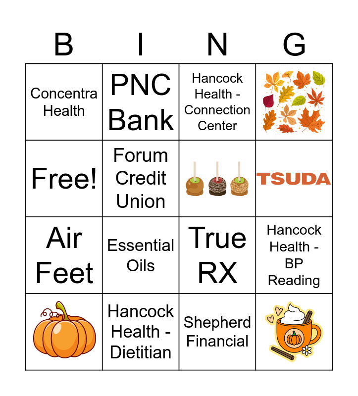 This bingo card has 5 images and 11 words: Hancock Health - Dietitian, Hancock Health - BP Reading, Hancock Health - Connection Center, Concentra Health, Air Feet, PNC Bank, True RX, Shepherd Financial, Free!, Forum Credit Union and Essential Oils.
