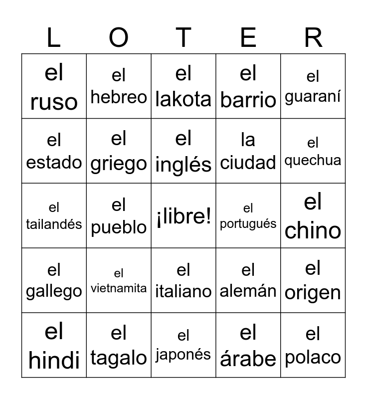 This bingo card has a free space and 34 words: el español, el árabe, el aymara, el coreano, el gallego, el griego, el guaraní, el hindi, el hebreo, el holandés, el inglés, el lakota, el náhuatl, el navajo, el portugués, el quechua, el tagalo, el tailandés, el vietnamita, el alemán, el italiano, el francés, el ruso, el chino, el japonés, el polaco, el barrio, la capital, la ciudad, el estado, el país, el pueblo, el origen and el idioma.