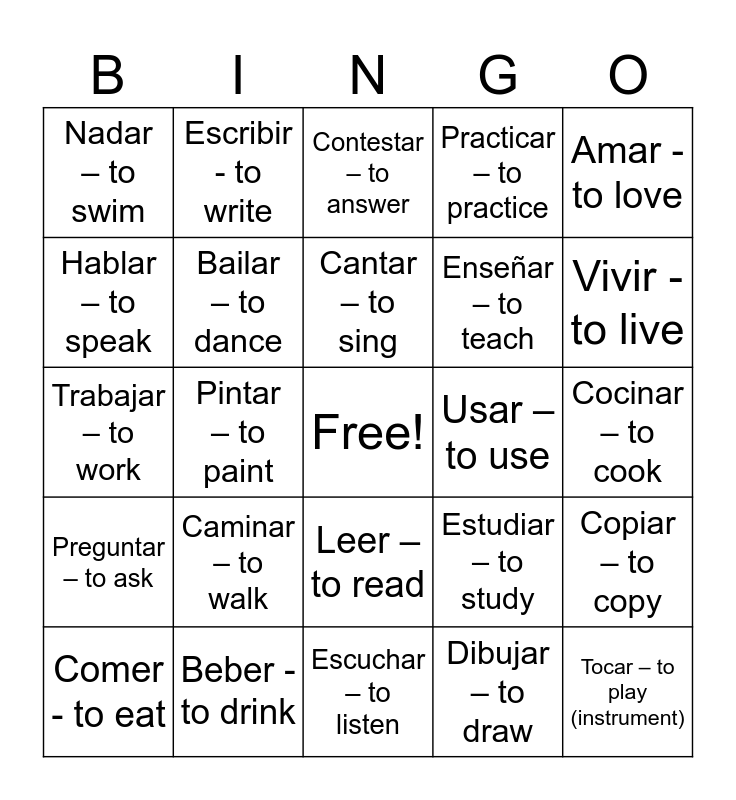 This bingo card has a free space and 27 words: Estudiar – to study, Aprender – to learn, Enseñar – to teach, Escuchar – to listen, Hablar – to speak, Contestar – to answer, Escribir - to write, Preguntar – to ask, Usar – to use, Copiar – to copy, Trabajar – to work, Practicar – to practice, Comer - to eat, Beber - to drink, Vivir - to live, Abrir - to open, Bailar – to dance, Cantar – to sing, Caminar – to walk, Nadar – to swim, Cocinar – to cook, Dibujar – to draw, Pintar – to paint, Tocar – to play (instrument), Leer – to read, Amar - to love and Tocar - to touch.