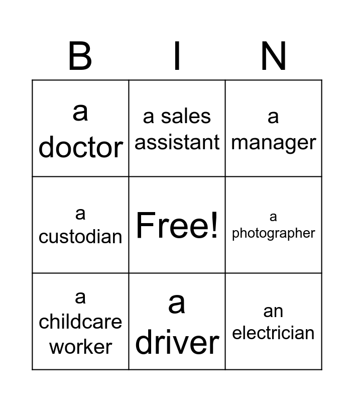 This bingo card has a free space and 18 words: a cook, a server, a manager, a doctor, a nurse, a custodian, a cashier, a sales assistant, a driver, an accountant, a painter, an electrician, a homemaker, a photographer, a childcare worker, a landscaper, a teacher and a construction worker.