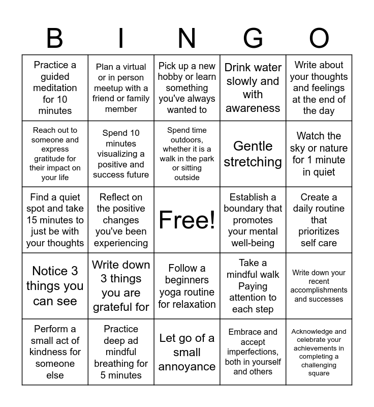 This bingo card has a free space and 24 words: Write down 3 things you are grateful for, Practice deep ad mindful breathing for 5 minutes, Spend time outdoors, whether it is a walk in the park or sitting outside, Perform a small act of kindness for someone else, Write about your thoughts and feelings at the end of the day, Practice a guided meditation for 10 minutes, Reach out to someone and express gratitude for their impact on your life, Plan a virtual or in person meetup with a friend or family member, Establish a boundary that promotes your mental well-being, Follow a beginners yoga routine for relaxation, Gentle stretching, Find a quiet spot and take 15 minutes to just be with your thoughts, Take a mindful walk Paying attention to each step, Write down your recent accomplishments and successes, Spend 10 minutes visualizing a positive and success future, Embrace and accept imperfections, both in yourself and others, Create a daily routine that prioritizes self care, Pick up a new hobby or learn something you've always wanted to, Watch the sky or nature for 1 minute in quiet, Reflect on the positive changes you've been experiencing, Acknowledge and celebrate your achievements in completing a challenging square, Notice 3 things you can see, Drink water slowly and with awareness and Let go of a small annoyance.