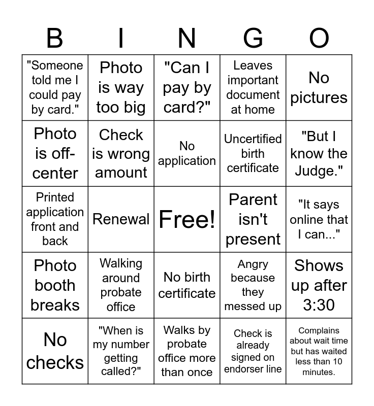 This bingo card has a free space and 24 words: Walking around probate office, "When is my number getting called?", No application, No checks, No pictures, "Someone told me I could pay by card.", Photo is off-center, Photo is way too big, Parent isn't present, No birth certificate, Uncertified birth certificate, Printed application front and back, Angry because they messed up, Shows up after 3:30, Check is wrong amount, Check is already signed on endorser line, "It says online that I can...", "Can I pay by card?", "But I know the Judge.", Renewal, Complains about wait time but has waited less than 10 minutes., Photo booth breaks, Leaves important document at home and Walks by probate office more than once.