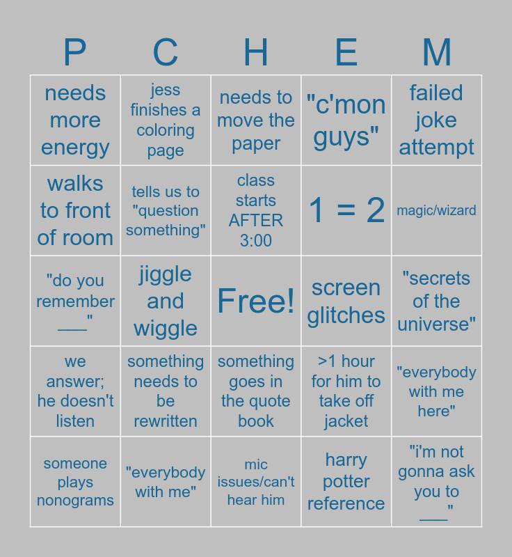 This bingo card has a free space and 31 words: mic issues/can't hear him, ends class AFTER 5:50, jiggle and wiggle, father dfather, needs more energy, needs to move the paper, tells us to "question something", >1 hour for him to take off jacket, screen glitches, harry potter reference, "secrets of the universe", "i'm not gonna ask you to ___", quiz password has a "!", caleb answers/asks a question, magic/wizard, "easy right", "everybody with me here", something needs to be rewritten, we answer; he doesn't listen, something goes in the quote book, failed joke attempt, someone asks "what did he say", someone plays nonograms, jess finishes a coloring page, 1 = 2, walks to front of room, "c'mon guys", "do you remember ___", "everybody with me", class starts AFTER 3:00 and random white old man on screen.