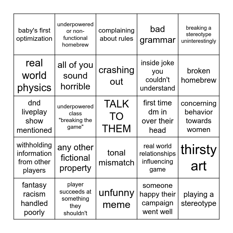 This bingo card has a free space and 29 words: fantasy racism handled poorly, antagonistic dm, underpowered class "breaking the game", "power gamer", baby's first optimization, complaining about rules, all of you sound horrible, any other fictional property, first time dm in over their head, player succeeds at something they shouldn't, concerning behavior towards women, playing a stereotype, unfunny meme, someone happy their campaign went well, broken homebrew, terrible understanding of dnd rules, tonal mismatch, withholding information from other players, breaking a stereotype uninterestingly, dnd liveplay show mentioned, real world relationships influencing game, dm favoritism, inside joke you couldn't understand, real world physics, bad grammar, underpowered or non-functional homebrew, thirsty art, crashing out and mentions a wotc employee.