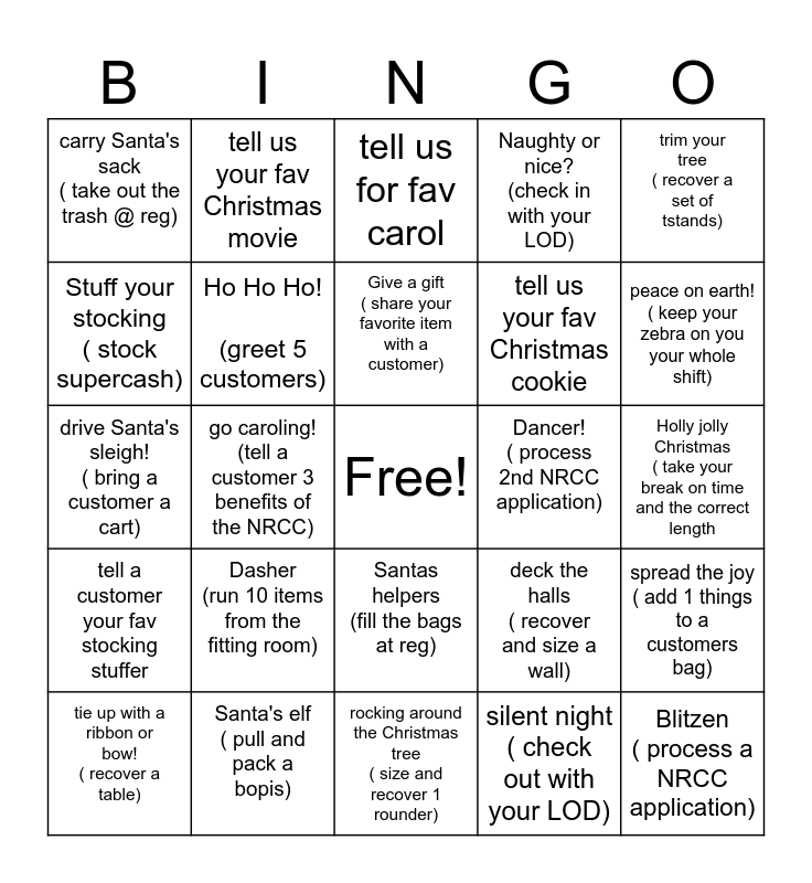 This bingo card has a free space and 24 words: Dasher (run 10 items from the fitting room), Santa's elf ( pull and pack a bopis), Give a gift ( share your favorite item with a customer), tie up with a ribbon or bow! ( recover a table), trim your tree ( recover a set of tstands), carry Santa's sack ( take out the trash @ reg), Stuff your stocking ( stock supercash), tell us your fav Christmas movie, Dancer! ( process 2nd NRCC application), Santas helpers (fill the bags at reg), tell us your fav Christmas cookie, drive Santa's sleigh! ( bring a customer a cart), deck the halls ( recover and size a wall), spread the joy ( add 1 things to a customers bag), Ho Ho Ho! (greet 5 customers), silent night ( check out with your LOD), Holly jolly Christmas ( take your break on time and the correct length, tell us for fav carol, peace on earth! ( keep your zebra on you your whole shift), go caroling! (tell a customer 3 benefits of the NRCC), Blitzen ( process a NRCC application), tell a customer your fav stocking stuffer, Naughty or nice? (check in with your LOD) and rocking around the Christmas tree ( size and recover 1 rounder).