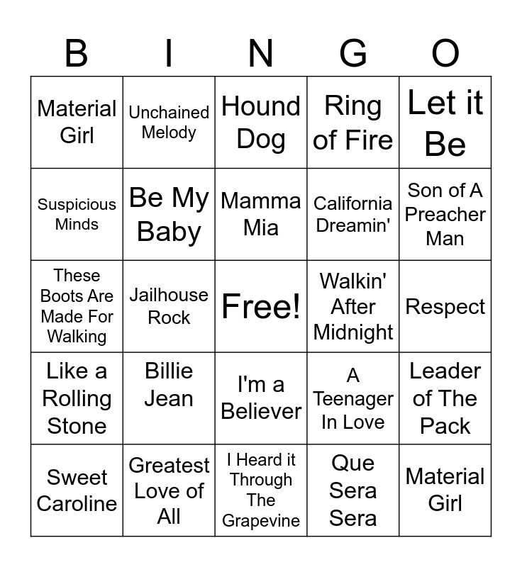 This bingo card has a free space and 24 words: Billie Jean, Greatest Love of All, Mamma Mia, Sweet Caroline, Let it Be, Material Girl, Suspicious Minds, Unchained Melody, Walkin' After Midnight, I'm a Believer, California Dreamin', These Boots Are Made For Walking, A Teenager In Love, Leader of The Pack, Be My Baby, Que Sera Sera, Respect, Hound Dog, Son of A Preacher Man, Jailhouse Rock, Material Girl, Like a Rolling Stone, Ring of Fire and I Heard it Through The Grapevine.