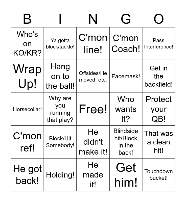 This bingo card has a free space and 24 words: Block/Hit Somebody!, Holding!, Offsides/He moved, etc., He got back!, Pass Interference!, Who's on KO/KR?, Wrap Up!, Ya gotta block/tackle!, Who wants it?, He didn't make it!, Facemask!, Horsecollar!, Blindside hit/Block in the back!, That was a clean hit!, Hang on to the ball!, Get him!, Protect your QB!, C'mon line!, Get in the backfield!, Why are you running that play?, Touchdown bucket!, C'mon ref!, C'mon Coach! and He made it!.