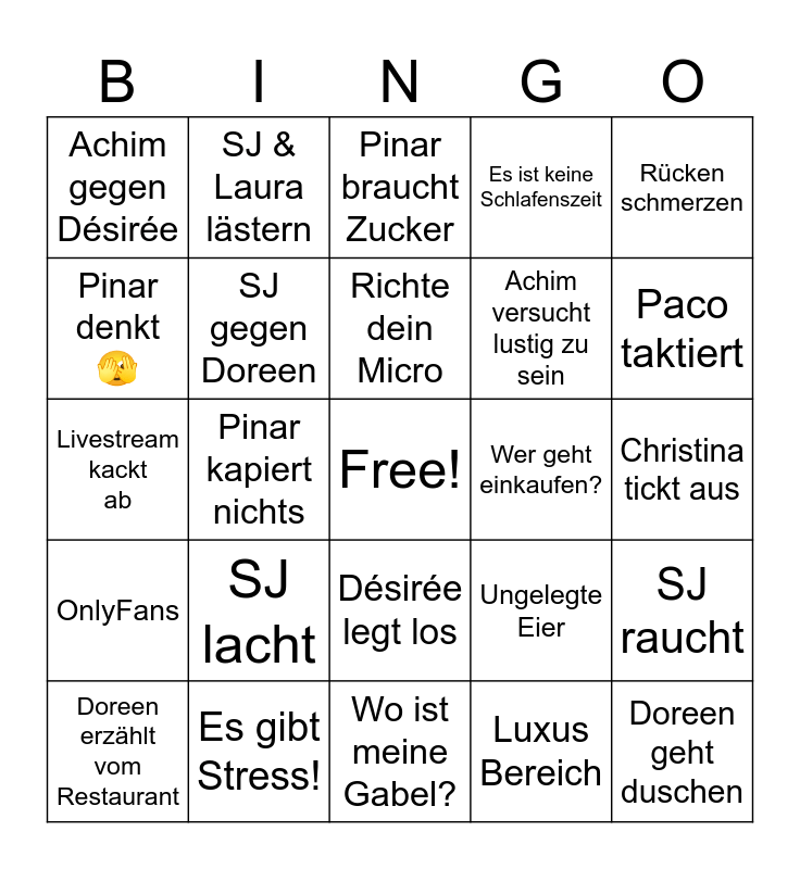 This bingo card has a free space and 24 words: SJ lacht, Es gibt Stress!, Richte dein Micro, Doreen erzählt vom Restaurant, Rücken schmerzen, Achim gegen Désirée, Pinar denkt 🫣, SJ & Laura lästern, Wer geht einkaufen?, Désirée legt los, Achim versucht lustig zu sein, Livestream kackt ab, Ungelegte Eier, SJ raucht, SJ gegen Doreen, Luxus Bereich, Christina tickt aus, Pinar braucht Zucker, Paco taktiert, Pinar kapiert nichts, Doreen geht duschen, OnlyFans, Es ist keine Schlafenszeit and Wo ist meine Gabel?.